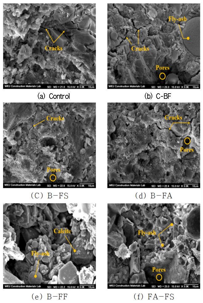 미분말에 의해 프리델씨염이 형성되는 측면과(Prang et al. 2022), 플라이애시의 포졸란 반응 등으로 인해 내부 조직구조가 치밀해지는 것에 기인한 것으로 사료된다(Liu et al. 2017) .