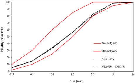 있으며, 캡슐의 형상 또한 천연잔골재와 유사하거나 상대적으로 둥근 형태를 띄고 있는 것을 알 수 있다. Fig. 3은 사용된 잔골재의 입도분포곡선을 나타낸 것으로 NSA, NSA 95 % 및 CMC 5 %를 혼합하여 사용한 혼합슬래그 잔골재는 표준입도분포곡선 범위를