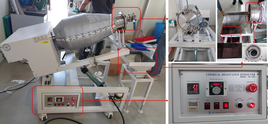 교반속도, 산용액 온도 및 경사각도 조절설비와 골재 세정 이후 골재와 액체 분리를 위한 고액분리 설비(~1 mm sieve) 등으로 이뤄져 있으며,