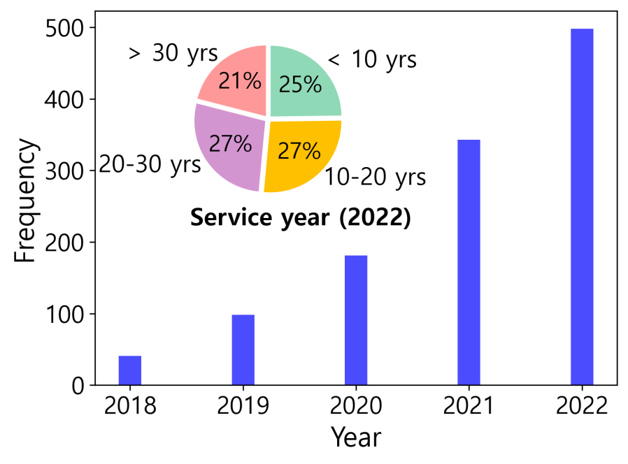 국내 도로시설물의 평균 사용연수는 2022년 기준 교량 16년, 터널 13년, 옹벽 12년이다(MOLIT 2022). Fig. 1은 앞서 언급한 도로교량의 평균 사용연수가 2018년 이후 지속적으로 증가한 추이를 나타낸다. 노후화 시설물은 준공 후 30년 이상 시설물을 의미하며,
