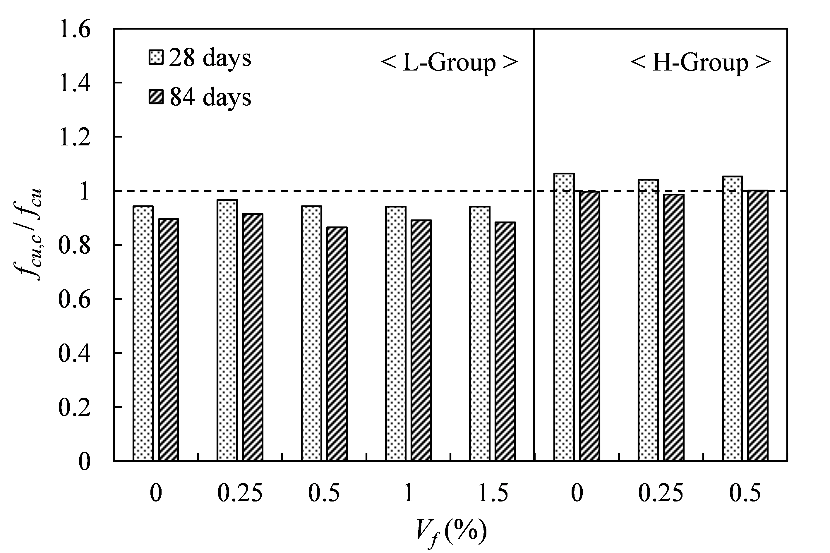 이때 마이크로 강섬유의 $V_{f}$는 L 그룹에서 0 %, 0.25 %, 0.5 %, 1.0 % 및 1.5 %로 변화하였으며, H 그룹에서는 $V_{f}$를