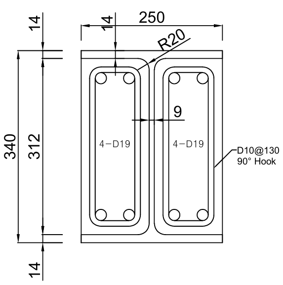 접합부가 없는 PEC 보와 제안한 접합부를 가진 PEC 보 모두 보의 크기는 폭 250 mm, 높이 340 mm로 하였다. PEC 보 제작에 사용된