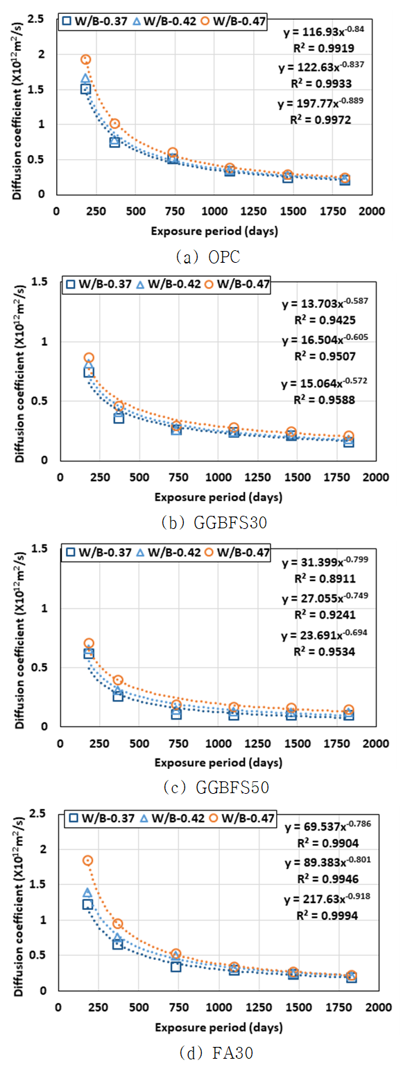 GGBFS 콘크리트는 모든 노출 조건에서 OPC 콘크리트 보다 노출 기간의 영향을 적게 받았으나, FA 콘크리트의 경우, 높은 초기 확산계수 값에