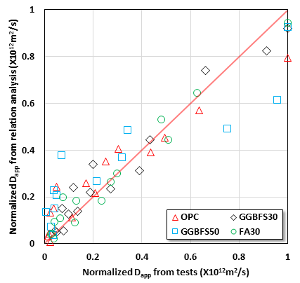 콘크리트는 시간의존적으로 성능이 개선되는 특성이 있으므로 상관관계 분석 시, 시간(노출 및 재령 기간)을 함께 고려하였다. 모든 노출 조건에서 GGBFS30