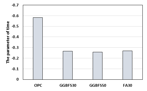 및 FA30 콘크리트는 0.94 이상의 높은 결정계수를 나타내었으며, OPC GGBFS50 콘크리트에서는 0.75~0.84의 결정계수 범위를 나타내었다.