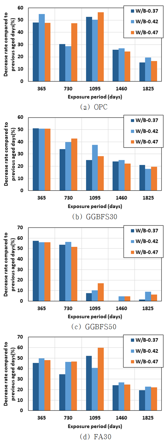 1) 선행 연구에서 수행한 장기 해양 환경 옥외 폭로 시험 결과에 따르면, 잠재수경성 및 포졸란 반응에 의해 GGBFS 및 FA 콘크리트에서는 OPC