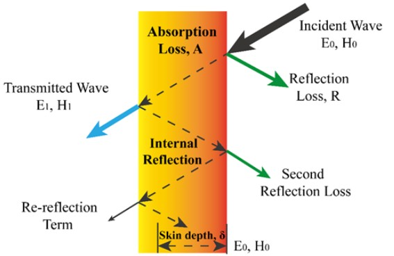 첫 번째로 재료의 표면 공기층에서 전파가 통과하는 차폐재의 임피던스 차이에 의하여 발생하는 반사손실이며, 두 번째는 주로 탄소계 또는 자성계 재료를