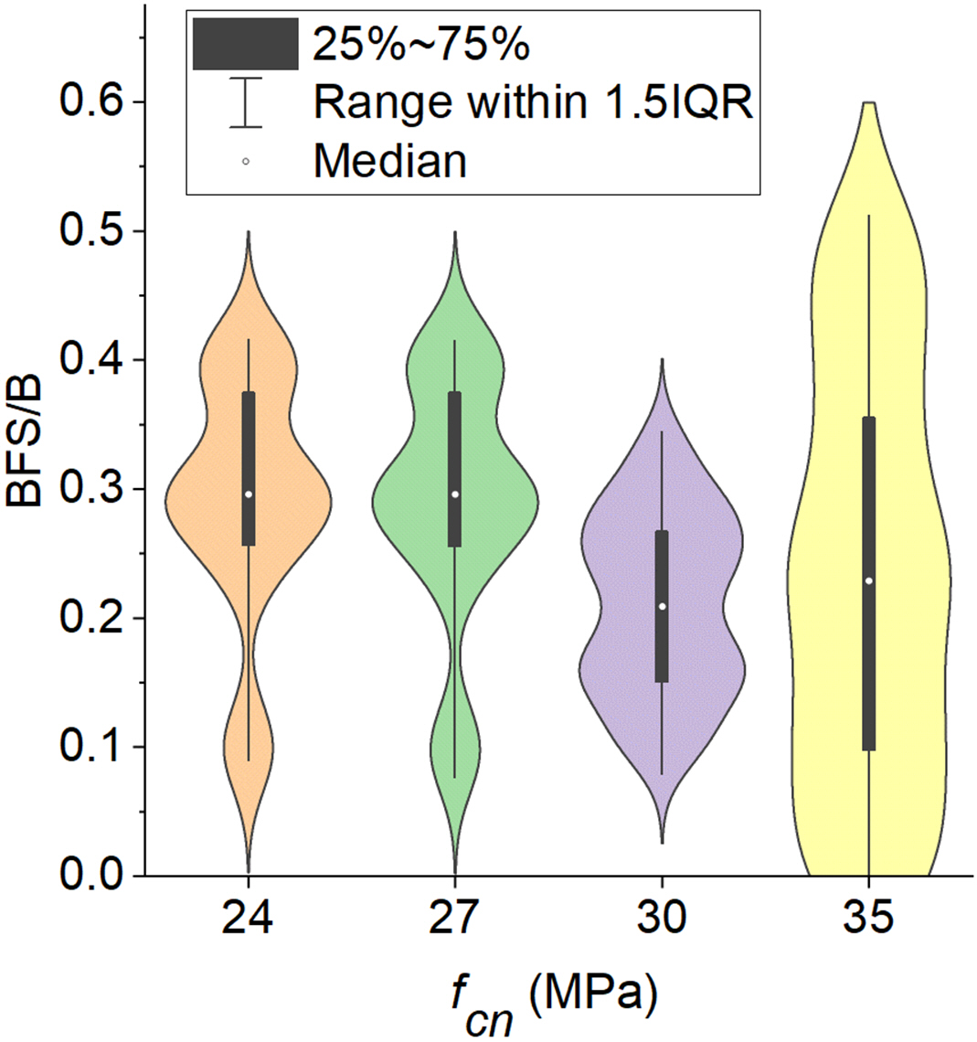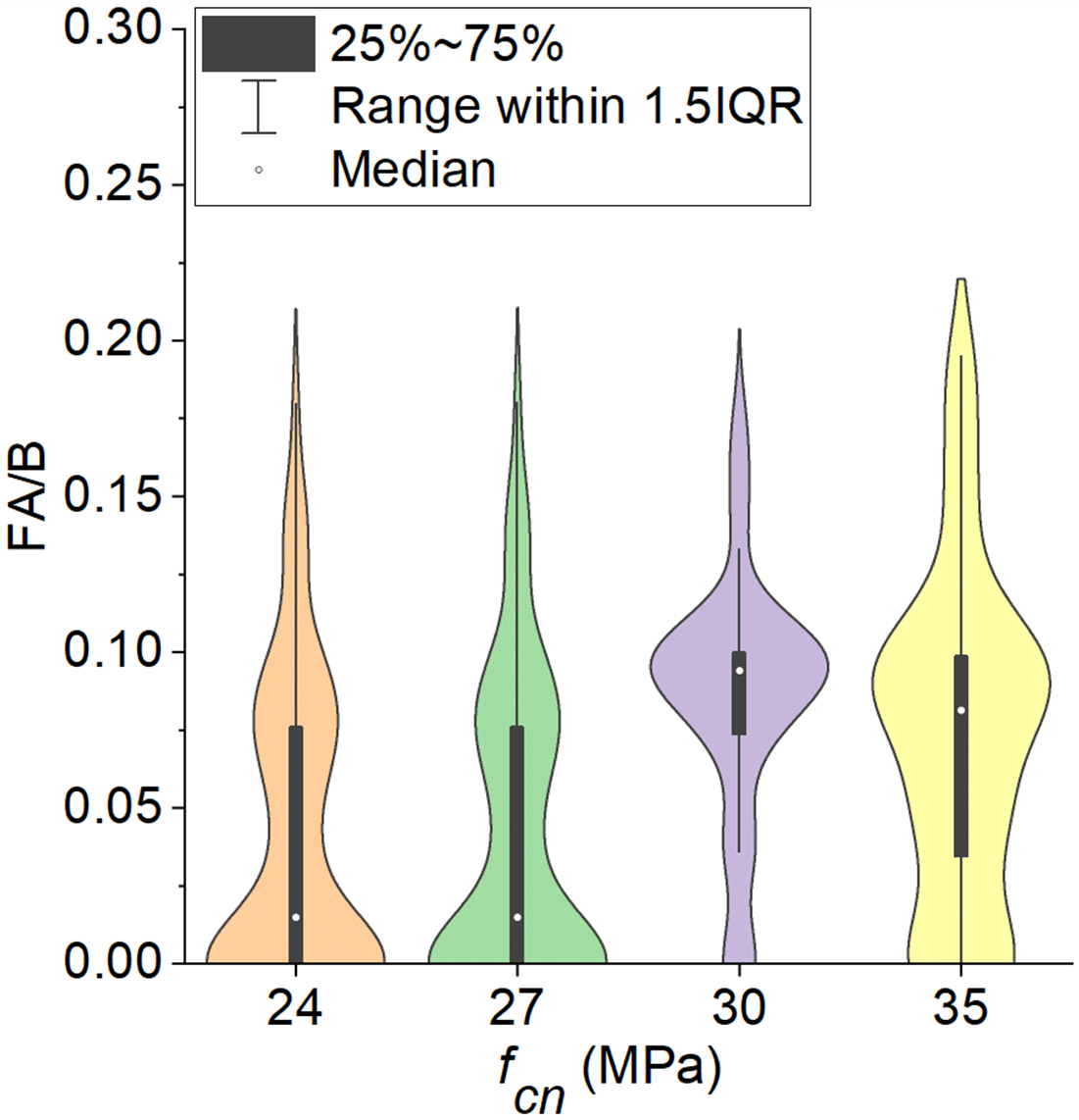 ash, FA)의 무게비(BFS/B, FA/B)를 계산하였다. 이 데이터의 분포를 통계적으로 보여주기 위해 바이올린 플롯(violin plot)을