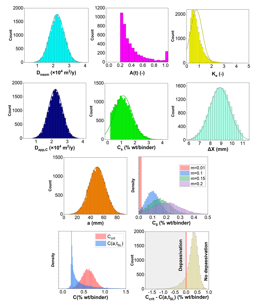 매우 큰 편차를 가지면, 그뿐만 아니라 임계염화물량, 표면염화물량, 철근피복두께 등도 실제 구조물에서 상당수준의 편차를 가지고 있다(Helland 2013). 따라서 초기염화물량 기준을 결정하는 데 있어서 변동성을 고려한 확률론적 해석이 중요한 이론적 근거를 제공할 수 있다(Guiglia and Taliano 2013; Šomodíková et al. 2020). 이미 충분히 다양한 확률론적 해석방법이 제시되어 왔으며, 이들 논문은 다양한 조건, 즉 하중상태(Guo et al. 2022), 콘크리트 내부