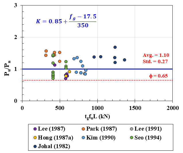 수정된 식을 적용하여 전체 외부접합부 실험체에 대한 공칭압축강도와 실험결과의 비를 나타내면 Fig. 15와 같이 좋은 대응을 보이는 것으로 나타났다.