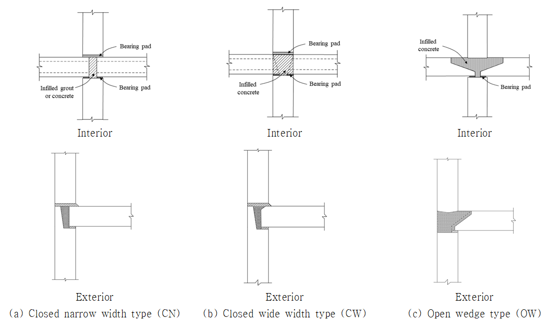 중력방향힘의 전달은 Fig. 2와 같이 상부벽체로부터 전달되는 수직방향 힘과 슬래브를 통하여 전달되는 수직방향 힘으로 구분될 수 있다. 수평접합부는 슬래브의 형태에 따라 Fig. 3과 같이 다양한 접합부 상세가 될 수 있다. 그림에서 Interior와 Exterior는 각각 내부접합부와 외부접합부를 나타낸다. 접합부에서 중력방향