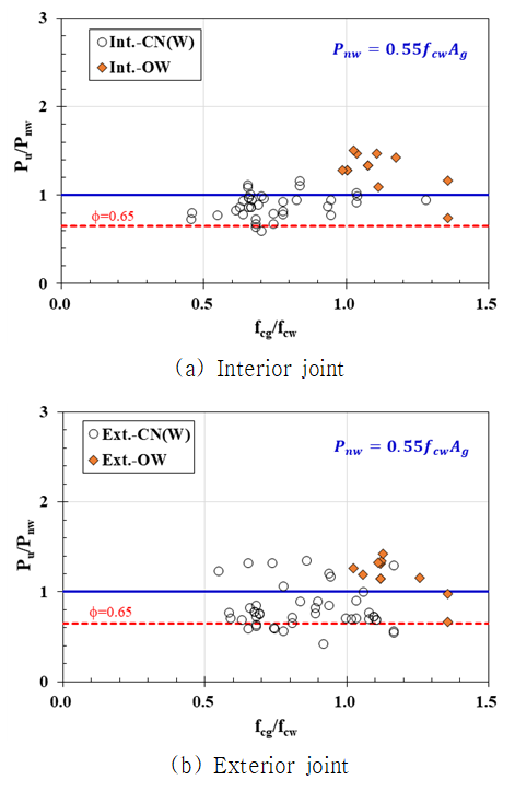 외부접합부에서는 그 비가 0.49~3.85로서 분산된 양상을 보이고, 다른 실험체들과 같이 그라우트폭이 좁은 CN과 CW 접합부에서 특히 과소평가하는
