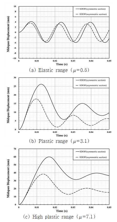 Table 7은 대칭 단면과 비대칭 단면의 소성 정도에 따른 최대 변위와 연성비 차이를 보여준다. 응답차트에서 구조물의 고유주기와 폭발하중의 지속 시간 비($t_{d}/T_{n}$)가