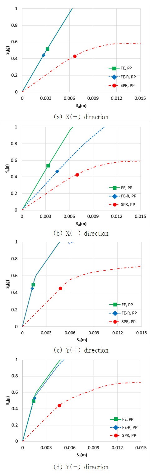 SPR 모델에서는 동일한 위치에서 1.58로 감소되었다. 이 경우도 Table 4에서 보듯이 Y 방향의 전단벽 수평력 지지 비율이 가장 높으므로 이를 지지하는 절점에서 최대 기대지내력 초과비가 발생하였다.