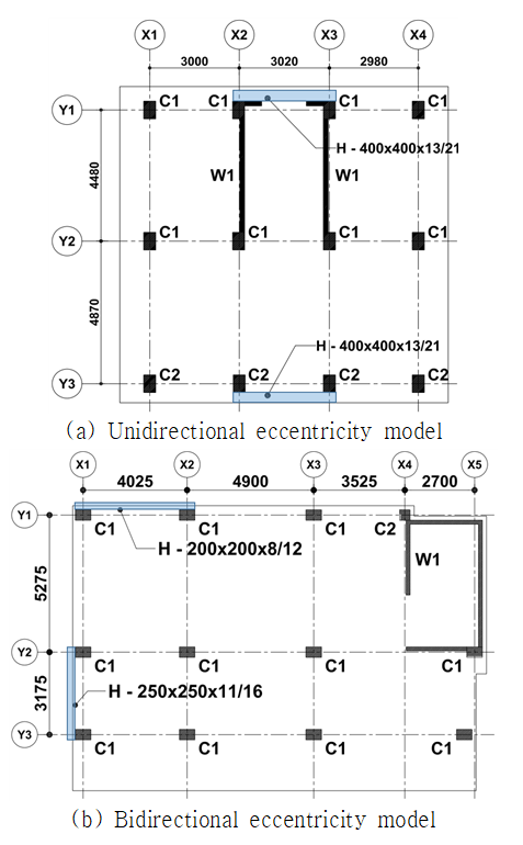 단방향 편심 모델(Fig. 6, Fig. 9(a) 참조)은 평면의 수평방향으로만 편심이 작용하는 건물이며, 양방향 편심 모델(Fig. 7, Fig. 9(b) 참조)은 평면의 수직과 수평방향으로 편심이 작용하는 건물이다. 주요 부재의 치수와 재료정수는 Table 1과 같다.