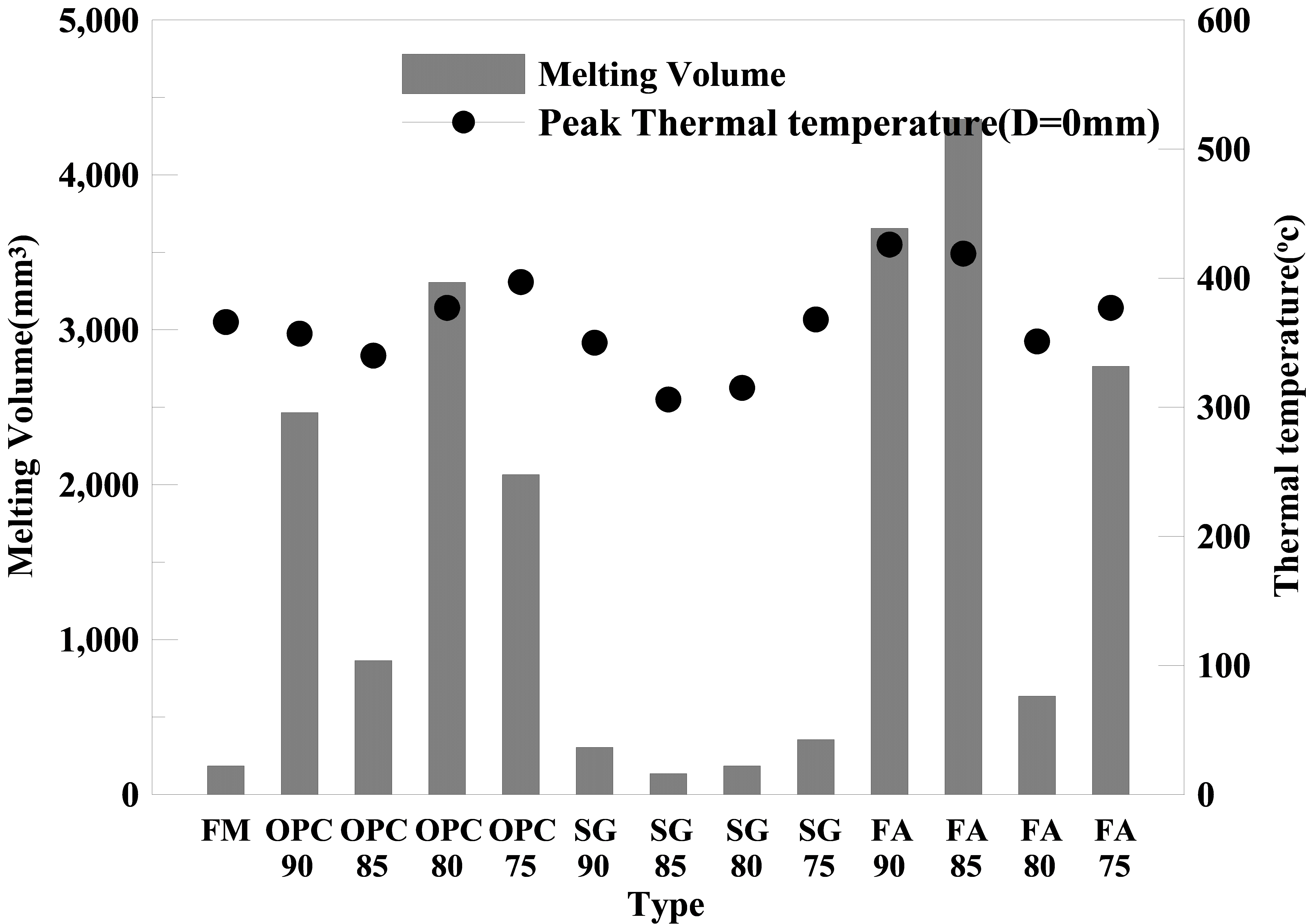 Fig. 10. Melting volume and peak thermal temperature after high-temperature exposure