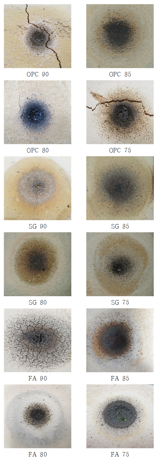 확인되었다. 이는 모르타르의 용융으로 인해 콘크리트 열전달을 촉진시켰고, 단열 성능 저하로 이어졌음을 시사한다. 특히 FA 75 및 FA 90 배합에서