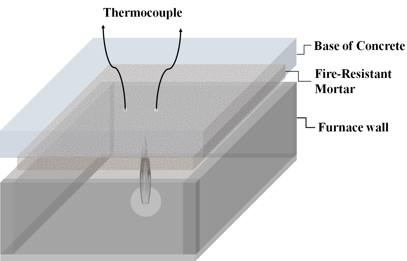 화재 모사 시험의 경우 RWS 및 HCM 화재 곡선을 준용하여 화재 시나리오를 모사하였으며, Fig. 3과 같이 가열로 하부에 가스(gas)와 산소를 사용하는 스토브(stove)를 설치하고, 고온에 견디는 내화 벽돌로 벽체를 구성하였다(CEN 2002). 상부 구조는 터널 내 콘크리트 구조물 조건을 모사하기 위해 콘크리트 면에 내화 모르타르를 피복하는 형태로 구성하였으며, 화재 지속 시간은 국토교통부