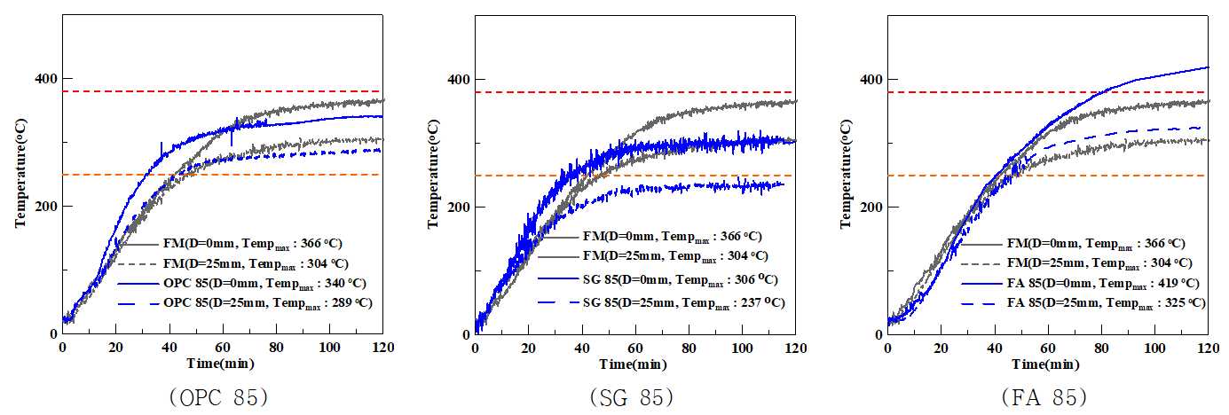 3) 화재 모사 시험 결과, SG 기반 모르타르를 피복한 콘크리트가 가장 낮은 수열 온도를 기록하였다(SG 85 기준, 표면 306 °C, 내부 237
