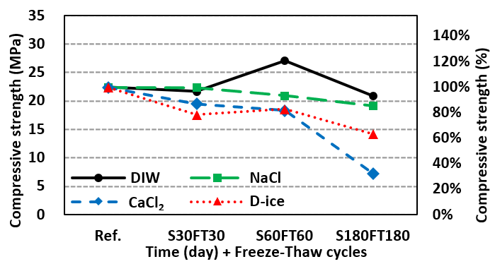 미세균열이 누적되어 물리적 성질의 저하가 발생했다. 특히 CaCl2 또는 제설 염수(D-ice) 노출은 Ca2+의 높은 반응성으로 결정생성으로 인한 팽창이 크게 일어나 NaCl보다 압축강도, 초음파 속도, 동탄성계수의 저하가 큰 것으로 나타났다.