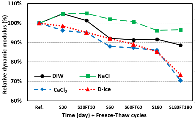 반면, CaCl2와 D-ice에 노출된 시편은 실험이 진행됨에 따라 각각 70 % 및 73 %의 상대동탄성계수로 감소하여 DIW에 NaCl에 비해 훨씬 큰 감소폭을