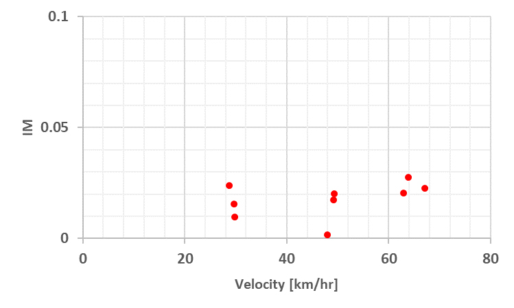 전, 후반 축의 중량 배분이 충격계수에 미치는 영향을 확인하기 위해 Fig. 20에 충격계수 분포를 도시하였다. 그림에 나타난 바와 같이, 충격계수가 0.2를 초과하는 경우는 모두 후반 2개 축의 중량이 전반 3개 축의 중량보다