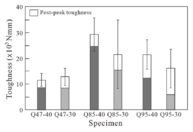 낮게 나타났다. 이는 Table 4에 나타난 바와 같이, 시험체 Q95-40과 Q95-30 표면에 부착 균열이 발생하는 등 탄소그리드와 모르타르 간 부착이 좋지 않았기 때문으로 판단된다.