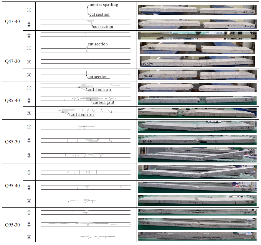 나타냈다. 반면, 인장력이 가장 큰 탄소그리드를 적용한 시험체에서는 광범위한 부착 균열이 발생하며 탄소그리드와 모르타르 간의 부착 성능이 저하된 손상