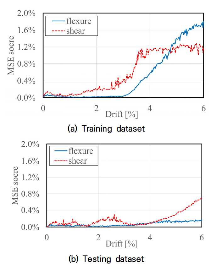 Fig. 8 Variation of MSE distribution with drift ratio for flexural and shear failure